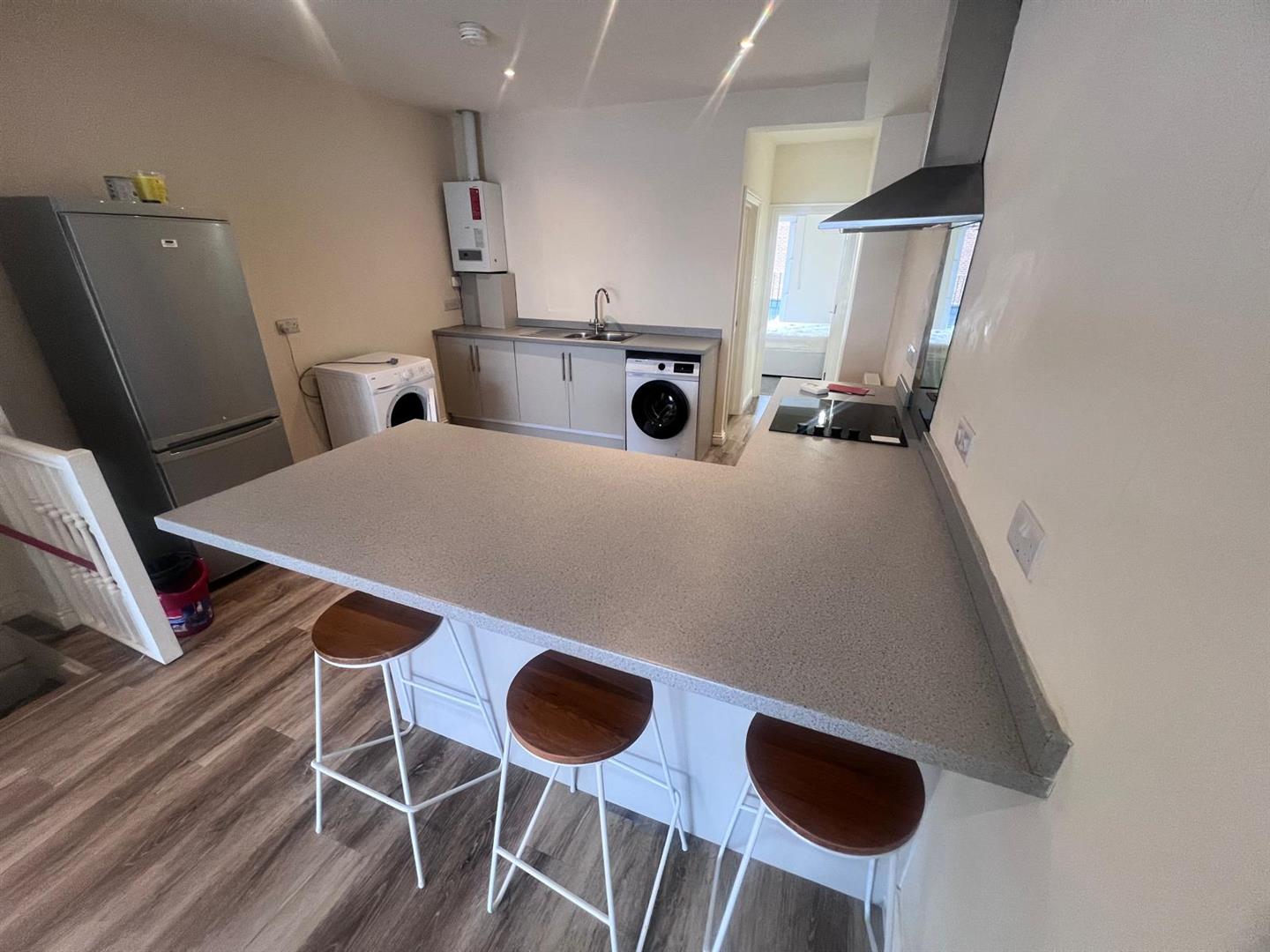 Range of wall and base units, built-in gas hob with electric oven, washing machine, tumble drier and space for fridge/freezer, 'Ideal' combination boiler, power points and double glazed door to roof top fire exit.