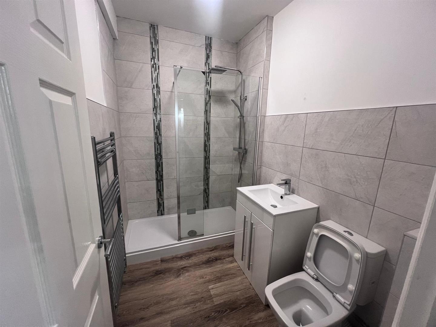 Frosted double glazed window to side aspect, shower cubicle with tiled surrounds, hand wash basin with mirror over, low level W.c.,