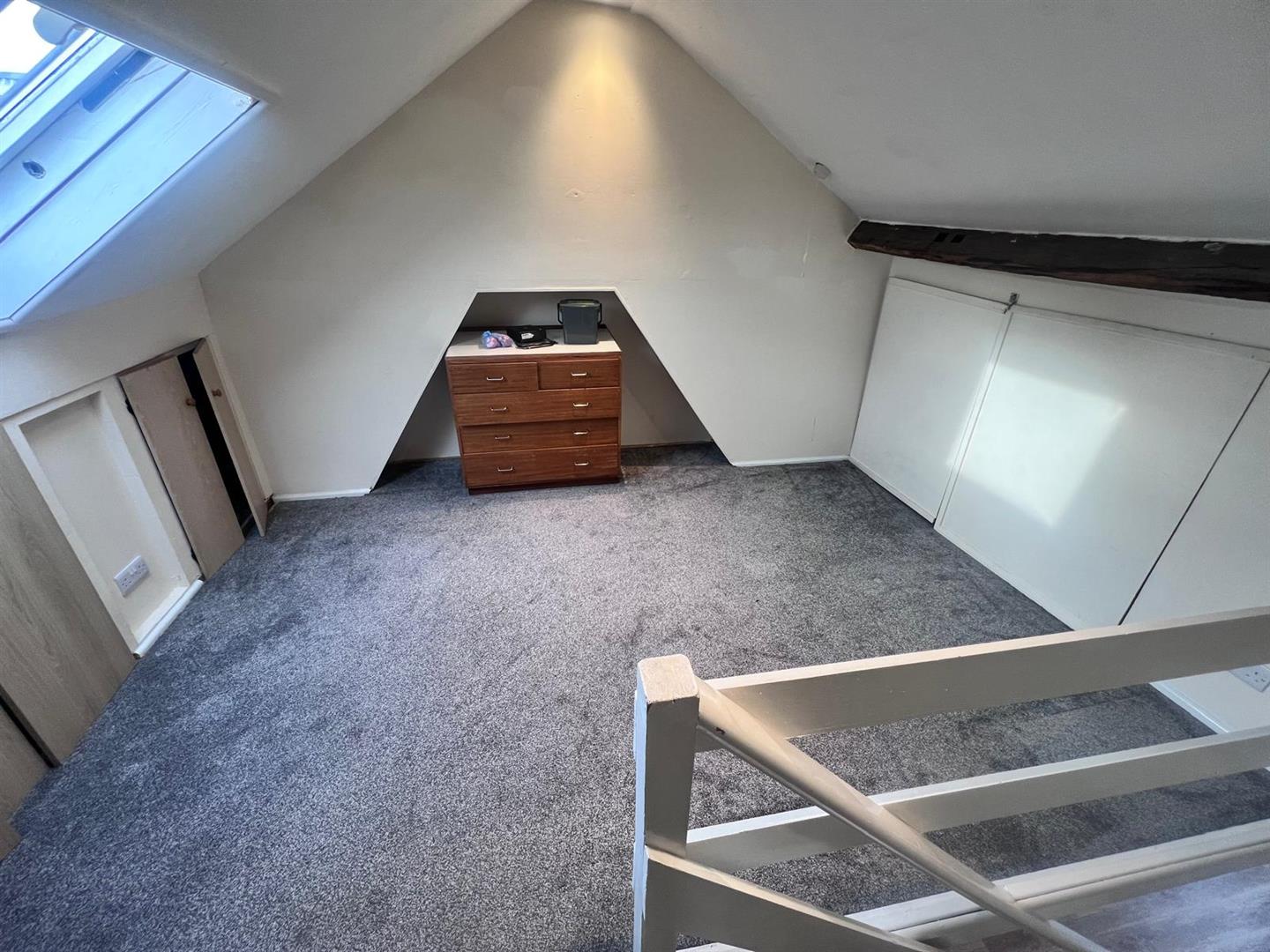 Skylight, radiator, carpet laid to floor, plenty of eaves storage, power points : table and chairs, coffee table and chair
